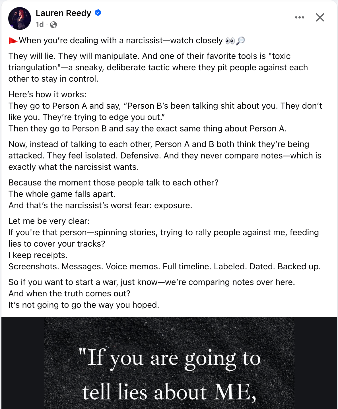 Reach out for bookings, inquiries, or to learn more about her performative activism and passive-aggressive responses to narcissistic injury, like the one below, posted by Lauren herself!